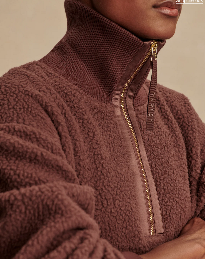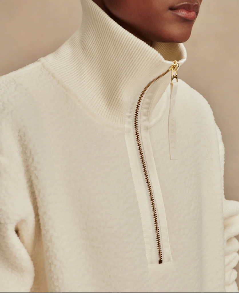 The Varley Roselle Half Zip Fleece is crafted from 100% recycled plush borg fleece, combining sustainability with comfort. Its half-zip collar and ribbed cuffs provide adjustable warmth, while the loose-fit sleeves ensure ease of movement. Signature side zip detailing and luxe sateen trim elevate this fleece, adding subtle sophistication to a versatile, eco-conscious wardrobe essential.